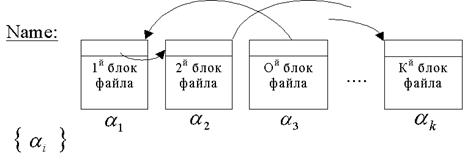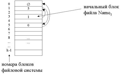 Все блоки файла организованны в единый список. Это означает, что в нулевом блоке файла имеется ссылка на 1-й блок, в первом блоке файла имеется ссылка на второй блок и т.д. до последнего? в последнем блоке файла соответственно ссылка = ΝULL. Это означает, что фактически решается проблема внешней фрагментации файла, т.е. файл в этом случае может произвольным образом расширяться