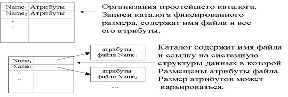 2. Каталог содержит имя файла – поле фиксированного размера, и ссылку уже на системные структуры данных или системную структуру данных, в которых находятся атрибуты соответствующих файлов. В этом случае получается более менее гибкую организацию по части размера атрибутов (они здесь могут быть достаточно произвольной длины.