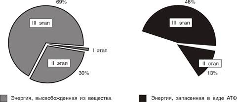 На втором этапе выделяется около 30% энергии, заключенной в молекуле. При этом запасается около 13% от всей энергии вещества (или примерно 43% от выделенной на этом этапе энергии.