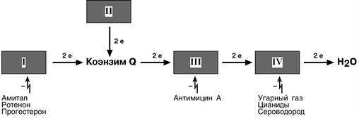 Ряд веществ может ингибировать ферменты дыхательной цепи и блокировать движение электронов от НАДН и ФАДН2 на кислород.