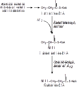 2. Участвует в превращении пропионил‑КоА в метил-малонил‑КоА, а тот далее в сукцинил-КоА. Т.о. витамин обеспечивает полное окисление остатков жирных кислот с нечетным числом атомов в катаболических реакциях, утилизацию треонина, валина, изолейцина, метионина, боковой цепи холестерола.