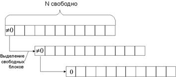 Все свободные блоки ФС организованы в однонаправленный список, структурная организация которого следующая: 1-й элемент этого списка – это есть массив из Ν ссылок, которые размещаются в суперблоке. Ν зависит от конкретной ОС, пусть это будет 100. 0-й элемент этого массива есть номер блока из пространства блоков ФС, в котором находится продолжение этого списка. Соответственно 0-й элемент этого блока есть ссылка на следующий массив из Ν ссылок и т.д. ФС оперативно работает с этим массивом. Если в нем есть свободные места, то при освобождении блоков, они записываются на свободные места, если требуются новые блоки, то они выбираются из этого массива. Если массив исчерпывается, то информация берется из следующего блока. Если массив полностью заполнен, т.е. освобождается много блоков, то выбирается следующий свободный блок и этот массив скидывается на этот блок. Это достаточно важная информация, которая в каждый момент отражает состояние ФС.