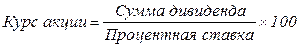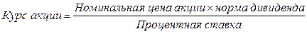 Известно несколько методов расчета курса акции. Основные элементы этих расчетов - сумма дивиденда на акцию и уровень процентной ставки за кредит. Курс акции прямо пропорционален сумме дивиденда и обратно пропорционален уровню процентной ставки. Расчет производится по формуле