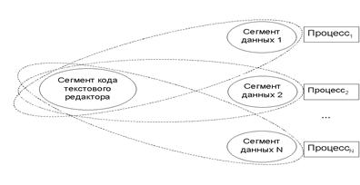 Например, при функционировании терминального класса одновременно могут быть сформированы несколько копий текстового редактора. В этом случае сегмент кода у всех процессов, соответствующих редакторам, будет единый, а сегменты данных будут у каждого процесса свои.