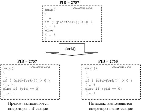 По завершении системного вызова fork() каждый из процессов – родительский и порожденный – получив управление, продолжат выполнение с одной и той же инструкции одной и той же программы, а именно с той точки, где происходит возврат из системного вызова fork(). Вызов fork() в случае удачного завершения возвращает сыновнему процессу значение 0, а родительскому PID порожденного процесса. Это принципиально важно для различения сыновнего и родительского процессов, так как сегменты кода у них идентичны. Таким образом, у программиста имеется возможность разделить путь выполнения инструкций в этих процессах. В случае неудачного завершения, т.е. если сыновний процесс не был порожден, системный вызов fork() возвращает –1, код ошибки устанавливается в переменной errno.