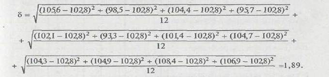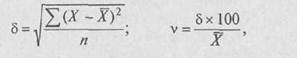 Коэффициент ритмичности определяют отношением числа периодов, за которые выполнен план, к общему их количеству. Торговым предприятием план товарооборота выполнен в девяти месяцах из двенадцати. Отсюда коэффициент ритмичности равен 0,75 (9: 12), или ритмичным его выполнение было только на 75,0 %. Для определения коэффициента равномерности необходимо по следующим формулам предварительно рассчитать среднее квадратическое отклонение (δ) и коэффициент вариации, или неравномерности (v):