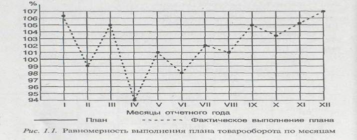 Для определения равномерности развития розничного товарооборота целесообразно также составить графики выполнения плана по месяцам (рис. 1.1), исчислить и проанализировать коэффициенты ритмичности и равномерности выполнения плана реализации товаров.