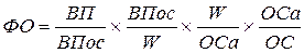 Данная формула позволяет определить влияние на динамику фондоотдачи изменения уровня специализации предприятия (ВП/ВПOC); коэффициента использования производственной мощности (ВПOC/W); фондоотдачи активной части ОС, исчисленной по производственной мощности (W/OCa); доли активной части фондов в общей их стоимости (ОСа/ОС).