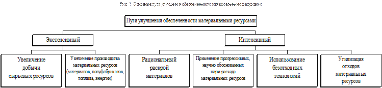 Материальные затраты составляют значительную долю всех затрат на производство продукции, работ, услуг. Поэтому необходимым условием организации производства продукции является обеспечение его материальными ресурсами: сырьем, материалами, топливом, энергией, полуфабрикатами и т.д. Стоимость материальных ресурсов входит в себестоимость продукции по элементу «Материальные затраты» и включает в себя цену их приобретения (без учета НДС и акцизов), наценки, комиссионные вознаграждения, уплачиваемые снабженческим и внешнеэкономическим организациям, стоимость услуг бирж, таможенных пошлин, плату за транспортировку, хранение и доставку, осуществленные сторонними организациями. Удовлетворение потребности предприятия в материальных ресурсах может обеспечиваться двумя путями: экстенсивным и интенсивным (рис.1). Экстенсивный путь предполагает увеличение добычи и производства материальных ресурсов и связан с дополнительными затратами. Кроме того, рост объема производства при существующих технологических системах привел к тому, что темпы истощения природных ресурсов и уровень загрязнения окружающей среды вышли за допустимые пределы. Поэтому рост потребности предприятия в материальных ресурсах должен осуществляться за счет более экономного их использования в процессе производства продукции или интенсивным путем.