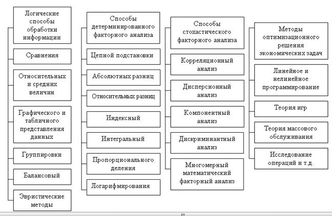 Среди них можно выделить традиционные логические способы, которые широко применяются и в других дисциплинах для обработки и изучения информации (сравнение, графический, балансовый, средних и относительных величин, аналитических группировок, эвристические методы решения экономических задач на основании интуиции, прошлого опыта, экспертных оценок специалистов и т.д.).