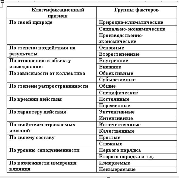 Исследуемые в анализе факторы могут быть квалифицированны по разным признакам, что позволяет точнее определить место и роль каждого фактора в формировании величины результативных показателей.