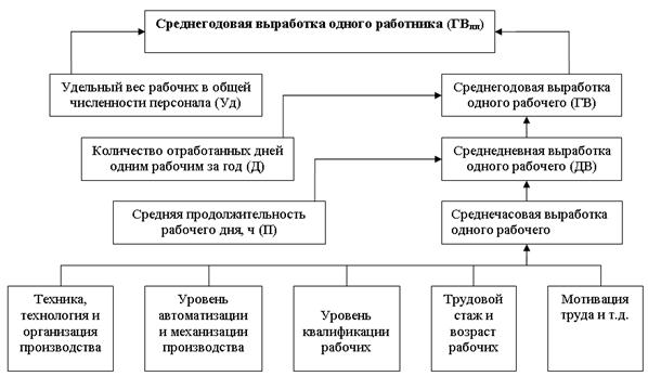 Наиболее обобщающий показатель производительности труда – среднегодовая выработка продукции одним работником. Его величина зависит не только от выработки рабочих, но и от удельного веса последних в общей численности персонала, а также от количества отработанных ими дней и продолжительности рабочего дня (рис.8.1.).
