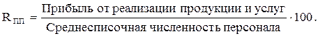 Большое значение для оценки эффективности использования трудовых ресурсов на предприятии в условиях рыночной экономики имеет показатель рентабельности персонала – отношение прибыли к среднесписочной численности производственного персонала: