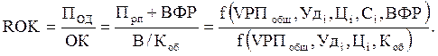 Аналогично осуществляется факторный анализ рентабельности операционного капитала (отношение прибыли от основной деятельности к средней сумме операционного капитала). Общая сумма прибыли от основной деятельности зависит от объема реализованной продукции (VРП), ее структуры (Удi), себестоимости (Сi), среднего уровня цен (Цi) и внереализационных финансовых результатов, относящихся к основной деятельности (ВФР).