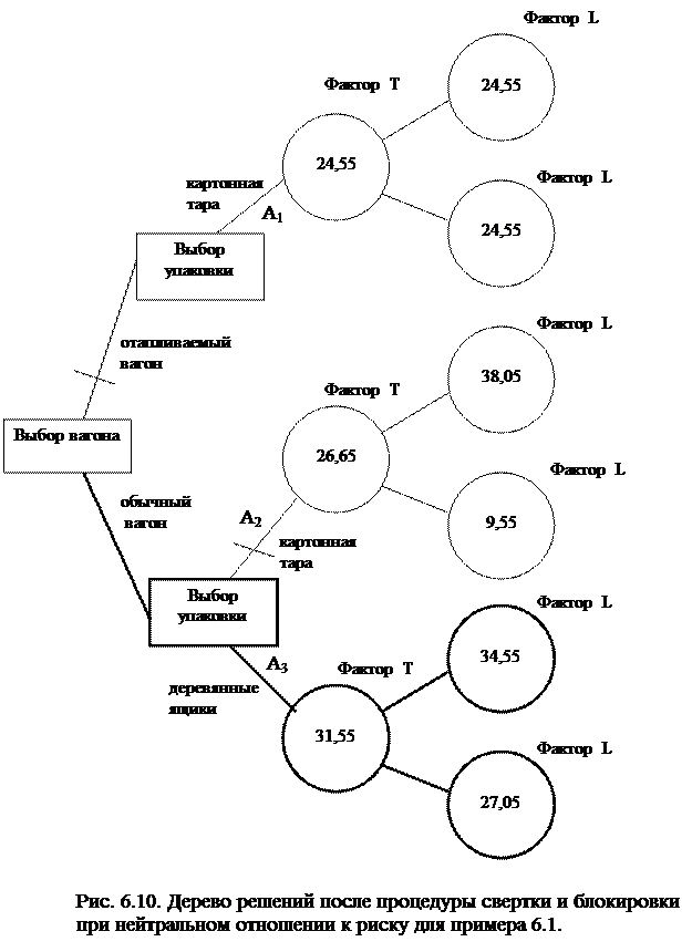 Как следует из табл. 6.2. и рис. 6.10., при нейтральном отношении к риску наилучшей является альтернатива А3 – (обычный вагон, деревянные ящики), поскольку она имеет наибольшее значение функции выбора по критерию EVC (остальные альтернативы заблокированы).