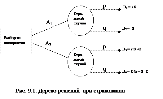 Как видно на рис. 9.1., без страховки при благоприятном стечении обстоятельств ЛПР получит D1 = (1+r)S-S = r·S как и ожидал; при неблагоприятном развитии событий без страховки он только потеряет вложенную сумму S и получит D2 = -S; приобретение страхового полиса дополнительно требует вложения суммы C и без наступления страхового случая он ЛПР получит D3 = r·S –C; при наступлении страхового случая при наличии страховки ЛПР полагается страховое возмещение и в итоге получит D4 = C·h – S - C.