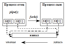 Сначала идет вызов pipe, затем fork(), благодаря которому образуется несколько процессов, и соответственно внутри if (fork()) процесс-отец, он закрывает дескриптор чтения и пользуется только записывающей стороной. В сыне происходит, соответственно, происходит все наоборот, он закрывает дескриптор записи и осуществляет чтение из канала. Как правило, канал используется как однонаправленное средство, т.е. данные будут передвигаться только в одном направлении, в данном случае от отца к сыну: отец записывает данные – сын их читает в том же порядке, в котором их записал отец. Обратите внимание на закрывание дескрипторов. Понятно, что это, в принципе, не нужно, поскольку если программа будет завершена, то все дескрипторы и так закроются. Но в данном случае эта строка имеет очень важный смысл: ранее уже говорилось о том, что при попытке чтения большего числа байт из канала, чем в нем находится, чтение будет заблокировано в том случае, если в канале не находится символ EOF, который туда попадает, когда закрывается последний записывающий дескриптор. Последний записывающий дескриптор будет закрыт тогда, когда его закроет процесс-отец, т.е. он запишет все необходимые данные, после чего закроет дескриптор, и собственно это будет означать, что больше данных не будет. В случае, если сын не закроет свой унаследованный дескриптор записи, то после того, как отец закроет свой дескриптор записи останется еще один записывающий дескриптор к тому же каналу в процессе сыне. Хоть он его и не использует (но системе-то это неизвестно), в последнем чтении процесс-сын зациклится, т.к. символ EOF в канал не попадает (поскольку в момент закрытия записывающей стороны это не последний записывающий дескриптор). Поэтому ненужные дескрипторы записи в канал важно обязательно закрывать, потому что иначе последнее чтение из канала будет заблокировано навечно.
