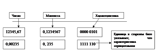 · Число представляется в виде двух чисел. Первая часть называется мантиссой, а вторая- характеристикой.