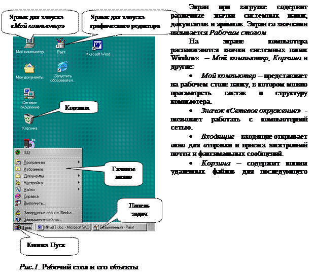 В нижней части рабочего стола находится светло-серая полоса – Панель задач. Она содержит кнопку «Пуск», которая предназначена для быстрого запуска программ и поиска файлов, а также обеспечивает доступ к справочной информации. Нажатие мышью кнопки Пуск открывает главное меню Windows 98.