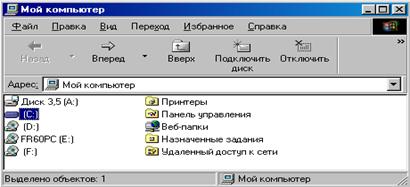 Значок "Мой компьютер" представляет на рабочем столе папку, как бы содержащую весь компьютер целиком. Чтобы просмотреть находящиеся на компьютере папки и файлы, нужно указать этот значок мышью и два раза нажать ее левую кнопку.