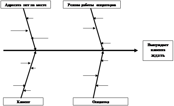 2. Диаграмма причин и результатов (диаграмма Исикавы). Чтобы понять ситуацию в полной мере, члены группы управления качеством решили провести обследование абонентов, которые в ответ на свой звонок слышали более пяти гудков. Методом мозгового штурма составили перечень факторов и представили их в виде диаграммы Исикавы (рис.6.9.). Затем операторы на протяжении 12 дней вели контрольные листки, включавшие несколько позиций, чтобы подсчитать результаты.