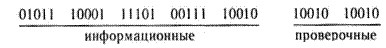 В результате сложения получили два проверочных числа — суммы по строкам и по столбцам. Таким образом, полный блок матричного кода будет состоять из семи пятиэлементных комбинаций, пяти информационных и двух проверочных (mQ = 5*5 = 25, Ј = 2*5 = 10). Проверочные комбинации обычно передаются в конце блока:
