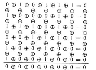 Далее произведем сложение по модулю 2 всех строк и всех столбцов информационной матрицы: