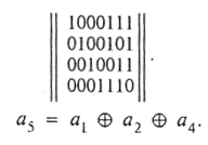 Обозначим элементы комбинации полученного семиэлементного кода а1, а2, аг, а4, а5, а6, а7, из которых a1, a2, а3, а4 — информационные и а 5, а6, а7 — проверочные. Последние могут быть получены путем суммирования по модулю два определенных информационных элементов. Разумеется, правило формирования проверочного элемента ai для любой кодовой комбинации одинаково.