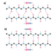 Стабильность спирали поддерживают водородные связи между атомами пептидных группировок аминокислот, расположенных на соседних витках спирали. Все условия, ведущие к формированию спиральных структур, могут успешно реализоваться и при другой форме расположения полипептидной цепи. Эту альтернативную спирали форму назвали -структурой. Она формируется при укладке цепи в форме плоских шпилек. -структура также стабилизирована водородными связями. Из двух или более b-структурных участков полипептидной цепи формируется b-слой. В грубом приближении она плоская и напоминает лист. Однако из-за того, что плоскости пептидных групп в каждом b-структурном участке наклонены поочередно в разные стороны относительно направления этого участка, плоский b-слой приобретает складчатую форму.