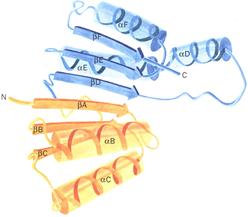 | Обобщенное изображение кофермент-связывающего домена в составе различных дегидрогеназ. Этот домен состоит из двух одинаковых по структуре babab единиц (один - желтого и один - синего цвета). Каждая единица связывает НАД (никотинамидадениндинуклеотид) и образует в месте связывания складку. |