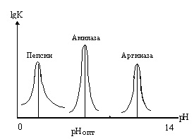 Слева приведены кривые зависимости активности фермента от изменения pH среды. Пепсин желудочного сока, который катализирует гидролиз белков, имеет pH-оптимум при pH=2. При pH=3 он теряет половину активности, а при pH=4 активность пепсина не измеряется. pH-оптимум амилазы, фермента, катализирующего расщепление крахмала, составляет 7,0. И в этом случае изменения pH на единицу приводит к снижению активности на 50%, а - на 2 единицы отмечается полная потеря активности. Относительно редко встречаются случаи, когда pH-оптимум активности ферментов находится в сильно кислой или щелочной среде. Это характерно для таких ферментов как пепсин и аргиназа (катализирует расщепление аргинина). Большинство белков при экстремальных значениях pH неустойчивы. рH-оптимум является важной характеристикой фермента, но ни как не исключительной, присущей только данному ферменту.
