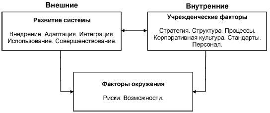Разделение систем ИТ на внешние и внутренние подсистемы необходимо для эффективной компенсации "давления" внешних и внутренних факторов. Чтобы выжить в современных условиях, компания должна постоянно приспосабливаться к изменяющемуся окружению.