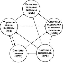 Связи между DSS и совокупностью TPS, KWS, MIS намеренно показаны неопределенными. Иногда DSS тесно связана с другими подсистемами. Но это только в том случае, если предприятие отличается высокой степенью автоматизации всех процессов. Обычно подсистема DSS изолирована от основных производственных информационных систем и использует их данные и информационные потоки для работы своих аналитических систем.
