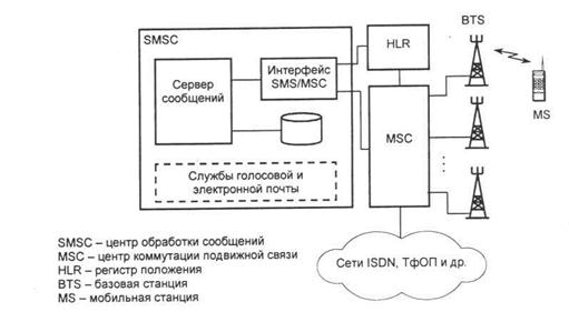 Для организации службы SMS (рис. 2.89) создается центр обработки сообщений (SMSC), который выполняет все функции, связанные с получением, промежуточным хранением и контролем за доставкой сообщений мобильным пользователям. Хотя состав входящего в SMSC оборудования и ПО может быть различным для разных сетей, в его структуре обычно выделяют типовые компоненты: это сервер сообщений (непосредственно занимается обработкой сообщений и отслеживает их доставку) и шлюзовое устройство, которое обеспечивает взаимодействие сервера с элементами сетевой инфраструктуры (ЦК мобильной связи MSC, регистром HLR), интерфейс со службами голосовой и электронной почты, а также связь с внешними для данной сети источниками сообщений, например центрами SMSC других мобильных систем.