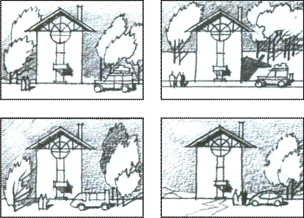 Расположение деталей антуража и стаффажа и проекций сооружения. На практике архитектору приходится чаще всего сталкиваться с проблемой компоновки деталей антуража и стаффажа с ортогональной проекцией здания, реже с его перспективным или аксонометрическим изображением