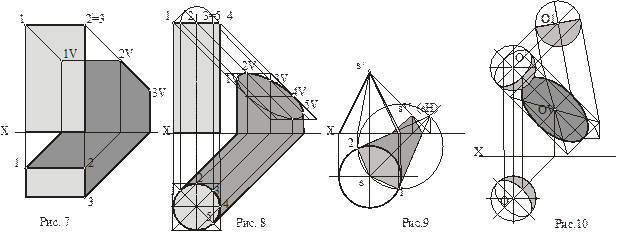 Тень призмы (рис. 7). Задняя и правая боковая грани призмы находятся в собственной тени. Ребра, разделяющие освещенные и затененные грани призмы, образуют контур собственной тени. Они представляют собой прямые частного положения, падающие тени от которых строятся просто (см. рис. 5). Ширина падающей тени на фасаде от столба прямоугольного поперечного сечения равна сумме сторон плана.