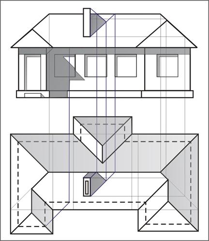 Рис. 12. Пример построения теней на фасадах и на плане крыши