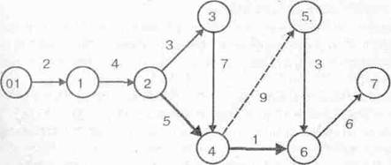 6) сетевое планирование. Это широко распространенный метод, основанный на использовании сетевых графиков. Сетевой график (рис. 2.1.) представляет собой цепь работ и событий, отражая их технологическую последовательность и связь.