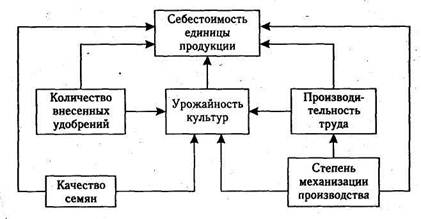 Например, на рис. 5.3 показана связь между себестоимостью единицы продукции растениеводства и такими факторами, как урожайность культур, производительность труда, количество внесенного удобрения, качество семян, степень механизации производства.