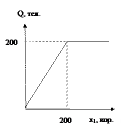 Пример 1.6.2. На конвейере сборка телевизоров осуществляется путем соединения корпуса и кинескопа, то есть имеется фиксированная пропорция использования ресурсов с1=с2=1 (1:1). Если на сборку поступило 200 корпусов и 500 кинескопов в месяц, то, по функции Леонтьева, будет собрано 200 телевизоров. Предельный продукт первого ресурса (корпусов) в этом случае равен 1, то есть дополнительно полученный со склада корпус позволит собрать 1 телевизор; предельный продукт второго ресурса (кинескопов) равен нулю, так как кинескопы имеются в избытке. Кривая выпуска показана на рис. 1.9.