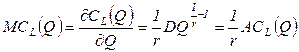 . При постоянной отдаче от масштаба производства r=1 кривая CL(Q) имеет вид луча, выходящего из начала координат. Это указывает на то, что долгосрочные издержки с расширением масштаба производства (