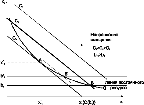Увеличение располагаемого объема постоянного ресурса приводит к сдвигу линии постоянного ресурса вверх. В результате комбинация ресурсов, обеспечивающая объем выпуска Q, будет постепенно приближаться к точке с координатами