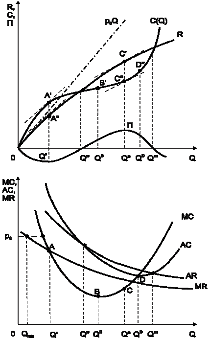 На рис. 3.8 изображены кривые валового дохода R, совокупных издержек С, прибыли П, а также зависимостей предельных и средних значений издержек и дохода. Отличие от вида соответствующих кривых в случае совершенной конкуренции состоит в том, что кривая дохода R имеет уменьшающийся темп роста при увеличении объема производства, и, соответственно, кривая предельного дохода MR является убывающей. Таким образом интерпретируется ситуация монополии. Ситуация монопсонии не приводит к характерным геометрическим отличиям, поскольку вид кривой предельных издержек в общем случае непосредственно не зависит от объема выпуска.