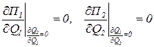 Анализ дуполии Курно[1] основан на предпосылке о том, что предположительные вариации равны нулю, то есть каждый из дуполистов считает, что изменения объема выпуска его продукции не повлияют на объем выпуска продукции конкурента. Равновесие Курно для обеих фирм определяется условиями:
