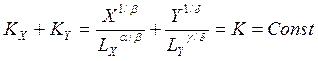 можно получить выражение кривой производственных возможностей, если один из ресурсов, например К, расходуется на выпуск обоих продуктов: