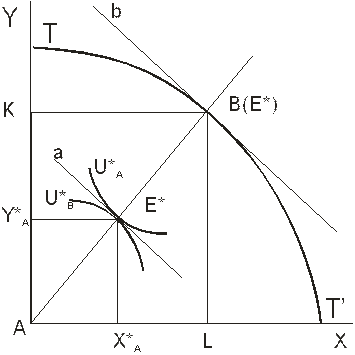 На рис. 5.6. в область производственных возможностей ТТ’ вписан фрагмент АВ коробки Эджуорта. Кривые безразличия субъектов А и В, U* А и U*B, касаются друг друга в точке Е*. Наклон линий а и b одинаков и характеризует одно и то же соотношение цен РX/Ру. Следовательно, структура выпуска товаров X и Y представляется эффективной и субъектам А, В, и производителям — предприятиям 1, 2.