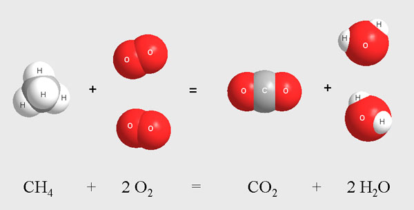 Рассмотрим типичную химическую реакцию: сгорание природного газа (метана) в кислороде воздуха. Те из вас, у кого дома есть газовая плита, могут ежедневно наблюдать эту реакцию у себя на кухне. Запишем реакцию так, как показано на рис. 5-1.