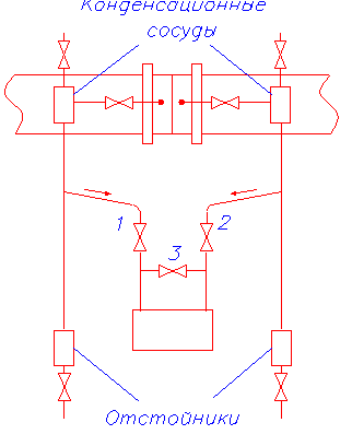 При продувках, сначала открывают вентиль 3 и обязательно закрывают вентили 1 и 2. После продувки, перед тем как открыть вентили 1 и 2, необходимо заполнить линии и конденсационные сосуды конденсатом. Заполнение осуществляют или за счёт конденсации пара в трубках или поступают следующим образом: закрывают вентили на точках отбора и через открытый верхний вентиль конденсационного сосуда заливают заранее подготовленный и охлаждённый паровой конденсат. После того, как линии и сосуды будут заполнены, закрывают вентили на конденсационных сосудах, открывают вентили после сужающего устройства, открывают вентили 1 и 2, закрывают уравнительный вентиль 3.