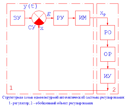 На рисунке представлена структурная схема одноконтурной автоматической системы регулирования. На схеме элементы автоматической системы изображены квадратами или прямоугольниками, в которые вписаны условные обозначения элементов: