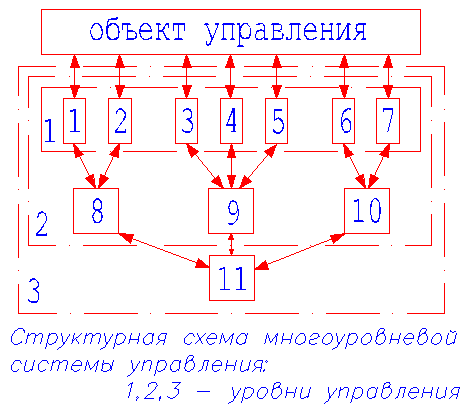 На рисунке представлена трёхуровневая система управления сложным объектом с разветвлёнными технологическими связями между установками. Отдельные технологические установки управляются децентрализовано из пунктов управления 1÷7. Это первый уровень управления. Наиболее ответственные регулируемые параметры этих установок передаются на пункты управления 8÷10 второго уровня управления. Основные параметры, определяющие технологический процесс объекта в целом, могут контролироваться из пункта управления 11 третьего уровня.